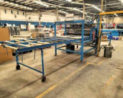2014 WALCO, CLOTH LAMINATING MACHINE, S/N 05-9473-7463, 5’ X 8’ RECEIVING TABLE, 5’ X 12’ ROLLER TABLE, 5-HEAD SPRAY BAR, 110-220 VOLTS